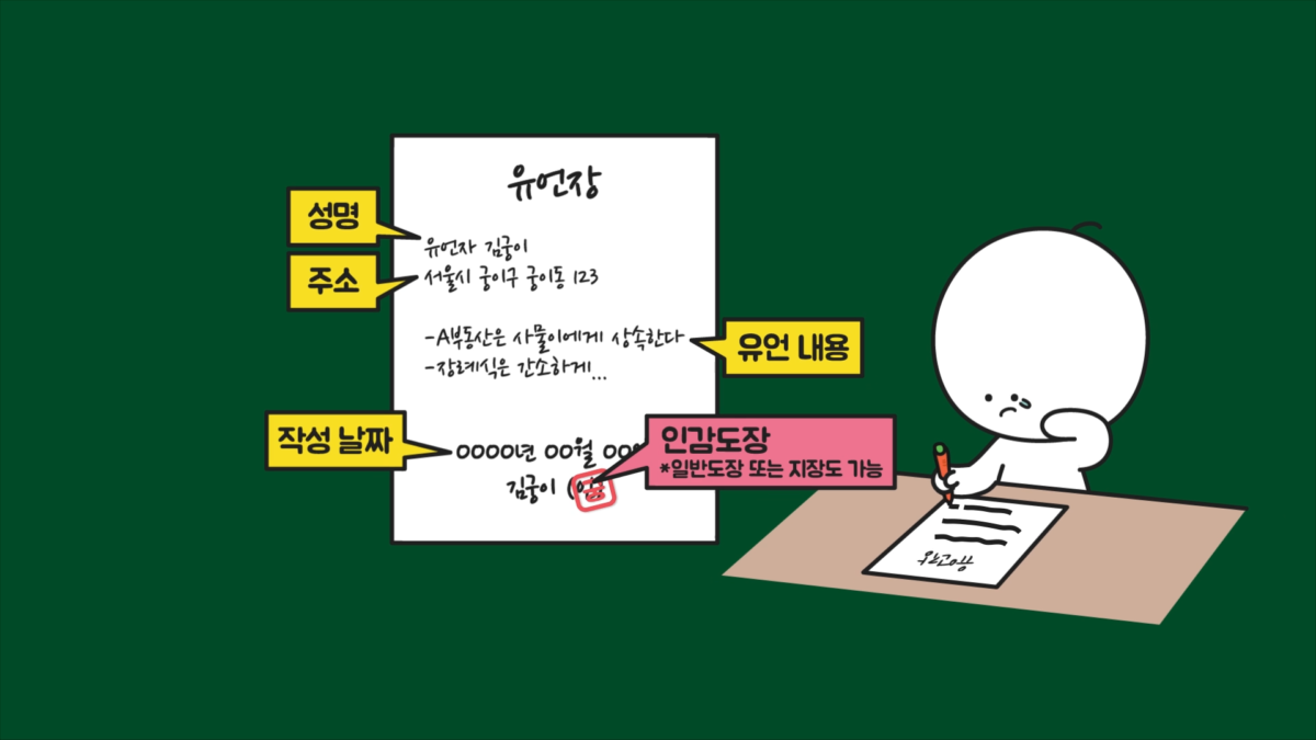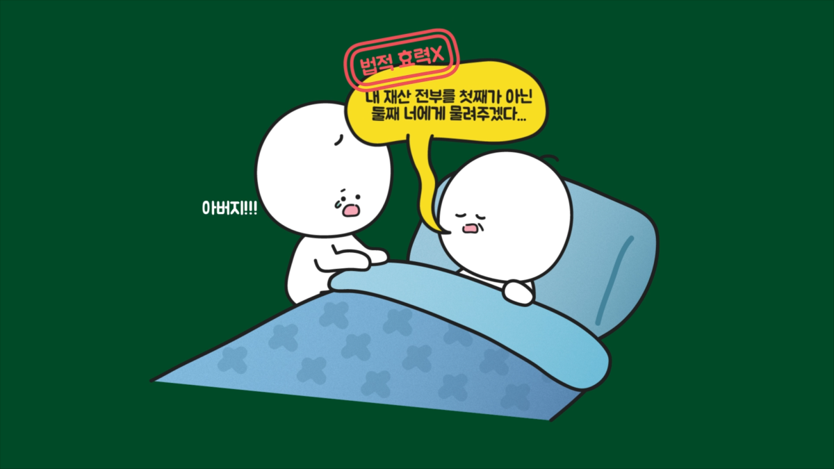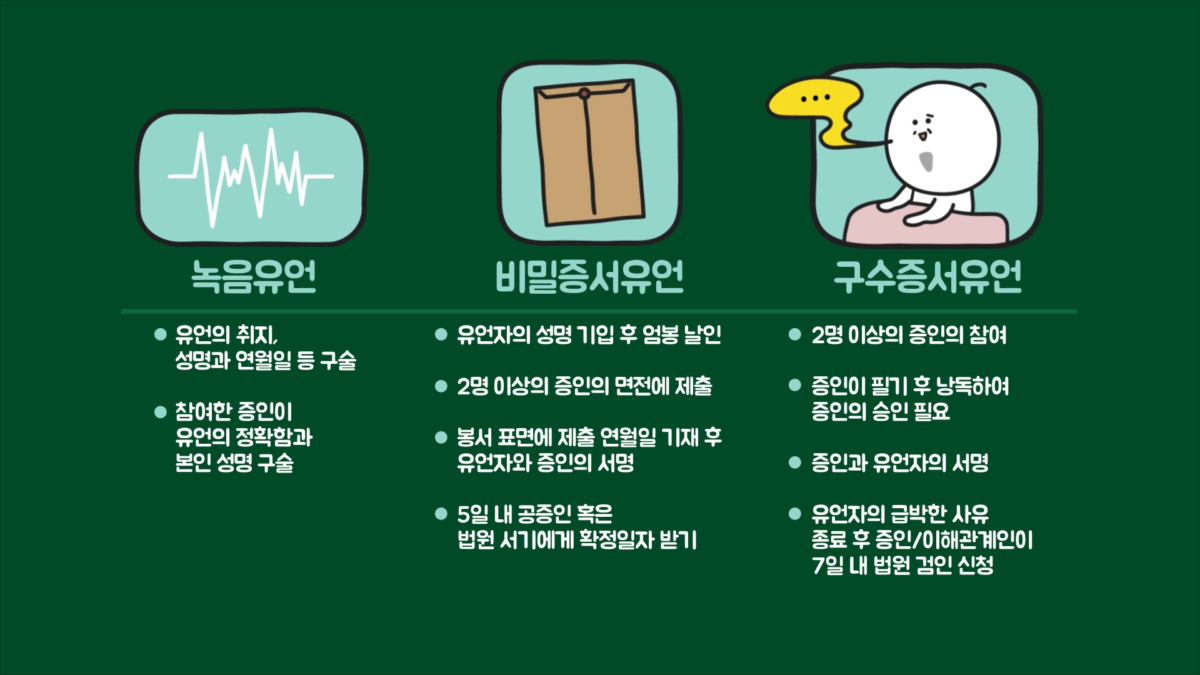 유언은 방법이나 형식 등을 엄격히 지켜줘야 하는 편으로 이미 죽은 사람의 의사를 다시 물어볼 수가 없으므로 혼란을 피하기 위해서입니다. 만약 유언이 일정한 방법이나 형식을 지키지 않으면 효력이 전혀 없으므로 다시 기본으로 돌아가 법에서 정한 상속법에 따라서 재산이 상속됩니다.