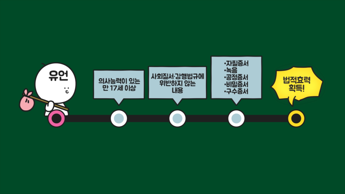 유언이 법적 효력을 지니려면 법에 따라 일련의 절차를 거쳐야 합니다. 기본적으로 만 17세 이상의 의사능력이 있는 사람이어야 하고, 사회질서·강행법규에 위반하는 내용은 불가하며, 자필증서나 녹음, 공정증서, 비밀증서, 구수증서 방식만 효력이 있습니다.