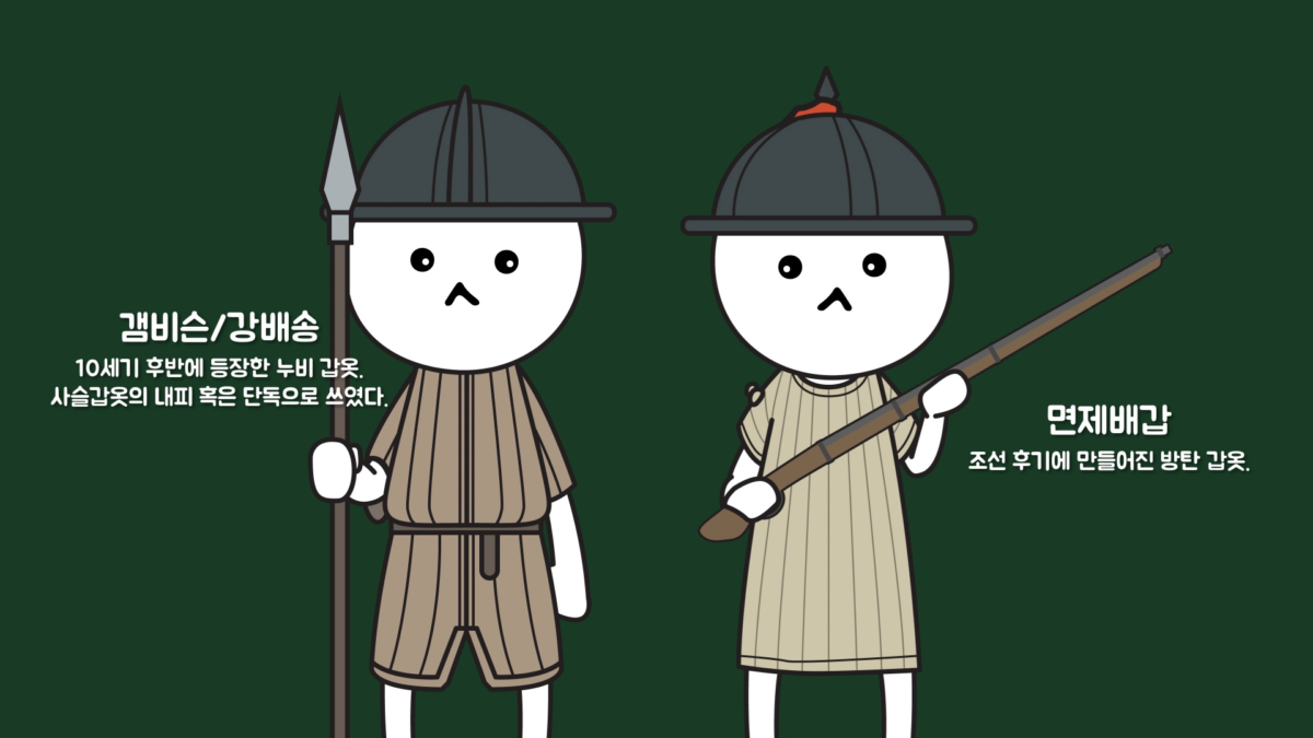 대표적으로 한지를 여러 겹 겹쳐서 작은 조각을 이용해 만든 지갑(紙甲)과 삼베를 여러 겹 겹쳐 만든 면제배갑(綿製背甲)이 있습니다. 종이나 천으로 만들었음에도 여러 겹이 겹쳐지면서 꽤 유의미한 방호력을 지녔다고 합니다. 그리고 현대의 방탄복은 이러한 형태에 더욱 질기고 탄성이 강한 섬유를 사용해 만들었습니다.