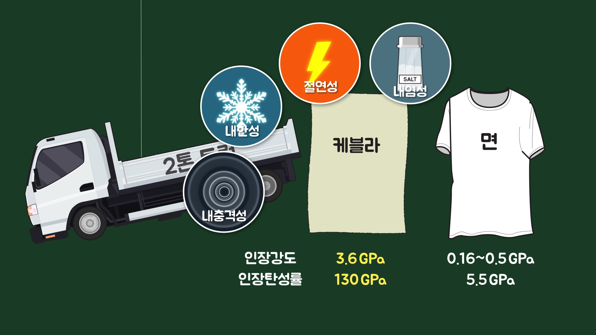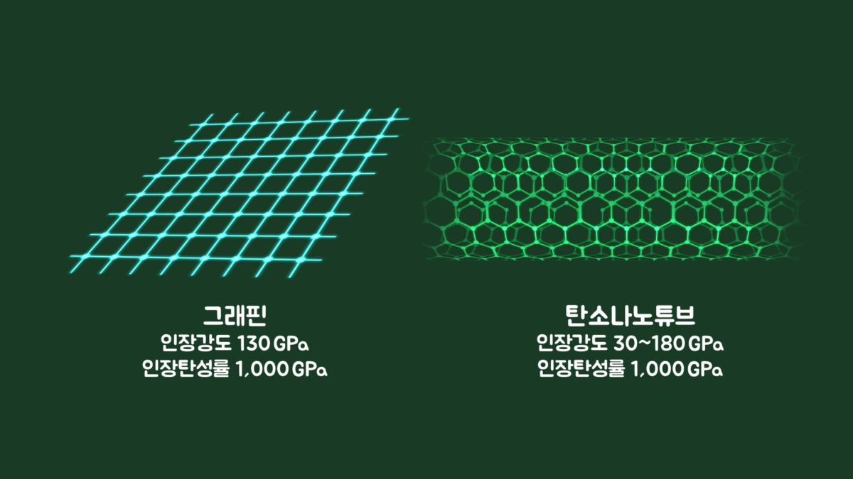 물체를 잡아당겼을때 찢어지기 전까지 견디는 힘을 인장강도라고 하고, 늘어나는 정도를 인장탄성률이라고 하는데, 방탄섬유로 잘 알려진 케블라(Kevlar)의 경우 인장강도가 3.6GPa이고, 인장탄성률은 130GPa로 매우 강력하다고 합니다.