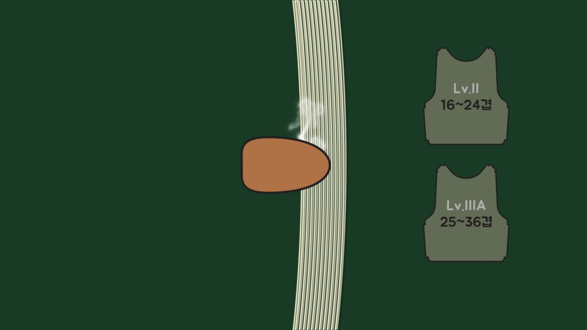 그래서 케블라로 수십 겹을 짜서 옷을 만들면 탄환이 쉽게 뚫지 못하고, 운동에너지를 차차 잃게 됩니다. 또 탄환이 뚫는 과정에서 발생하는 열이 섬유를 녹여 응집 작용이 일어나는 것과 탄환이 납작하게 눌리면서 관통력이 약해지는 것도 한몫합니다.