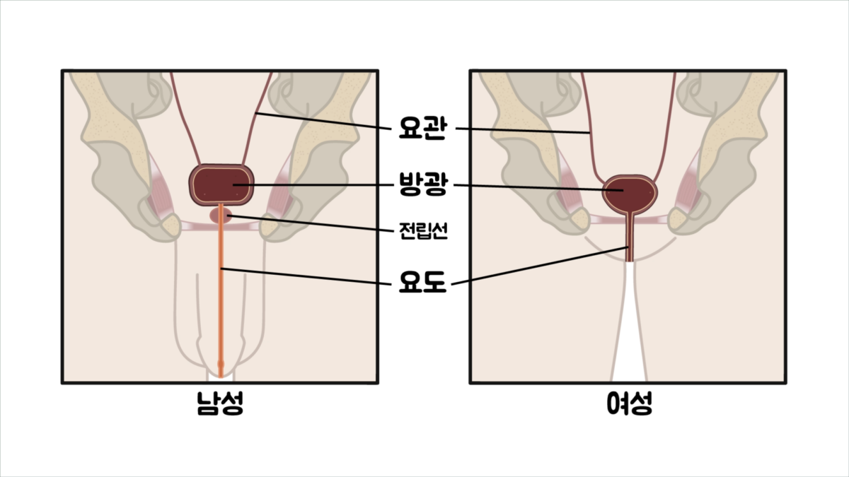 동물은 오줌의 생성과 배출의 과정을 통해 노폐물을 제거하고, 생명을 유지하는 데 필요한 여러 균형 상태를 조절합니다. 신체의 필수적인 기능 중의 하나인데, 이러한 생리적 과정은 성별에 따라 해부학적인 차이가 있긴 해도 오줌이 신장(콩팥)에서 만들어져서 요관을 통해 방광으로 이동되어 저장됐다가 배출되는 과정은 같습니다.