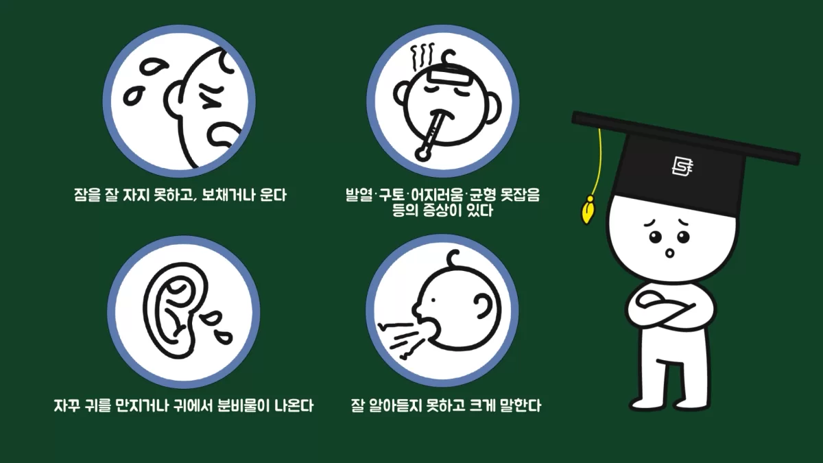 매우 흔한 증상이므로 소아에게서 중이염 의심 증상이 있으면 의사의 진료를 받아야 합니다. 때를 놓치면 발달에 영향을 줄 수 있습니다. 궁금증이 해결되셨나요?