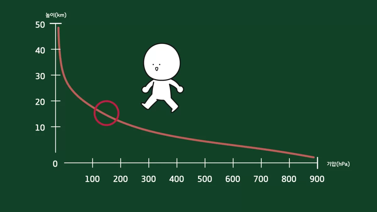 여기까지 이해했다면 귀가 먹먹해지는 증상이 발생하는 높은 곳으로 이동하는 상황으로 와보겠습니다. 높이 올라가면 공기의 양이 줄어들면서 기압이 변하게 됩니다. 기압은 지표에서 10m를 올라갈 때마다 1.2hPa씩 낮아지고, 10km 이상에서는 10m를 올라갈 때마다 0.4hPa씩 낮아집니다.