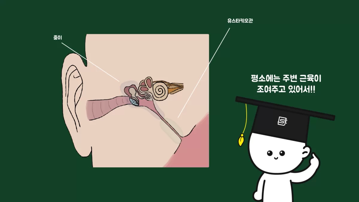 입구가 열린 틈에 유스타키오관 안쪽 높은 압력의 공기가 구멍을 통해 빠져나오면서 기압 평형을 이루고, 고막이 팽창하지 않게 되어 귀가 먹먹해지는 증상이 사라지게 됩니다.