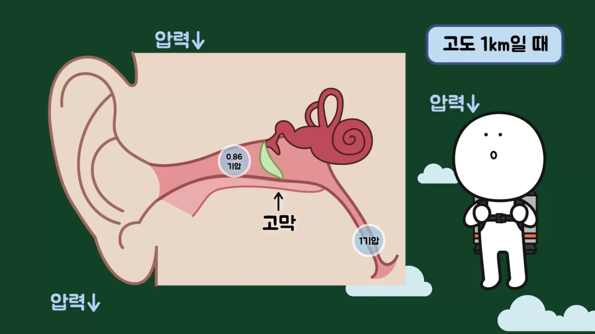 각설하고, 앞서 유스타키오관은 사실상 닫힌 공간이라고 했습니다. 이 상태에서 높은 곳으로 이동하면 유스타키오관 공간의 공기는 지상에 있었을 때의 높은 기압이 유지된 상태로 낮은 기압의 장소로 이동하게 됩니다.
