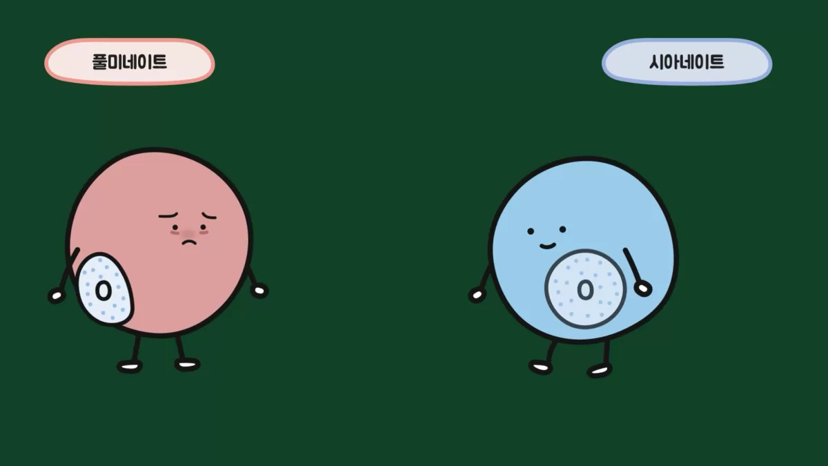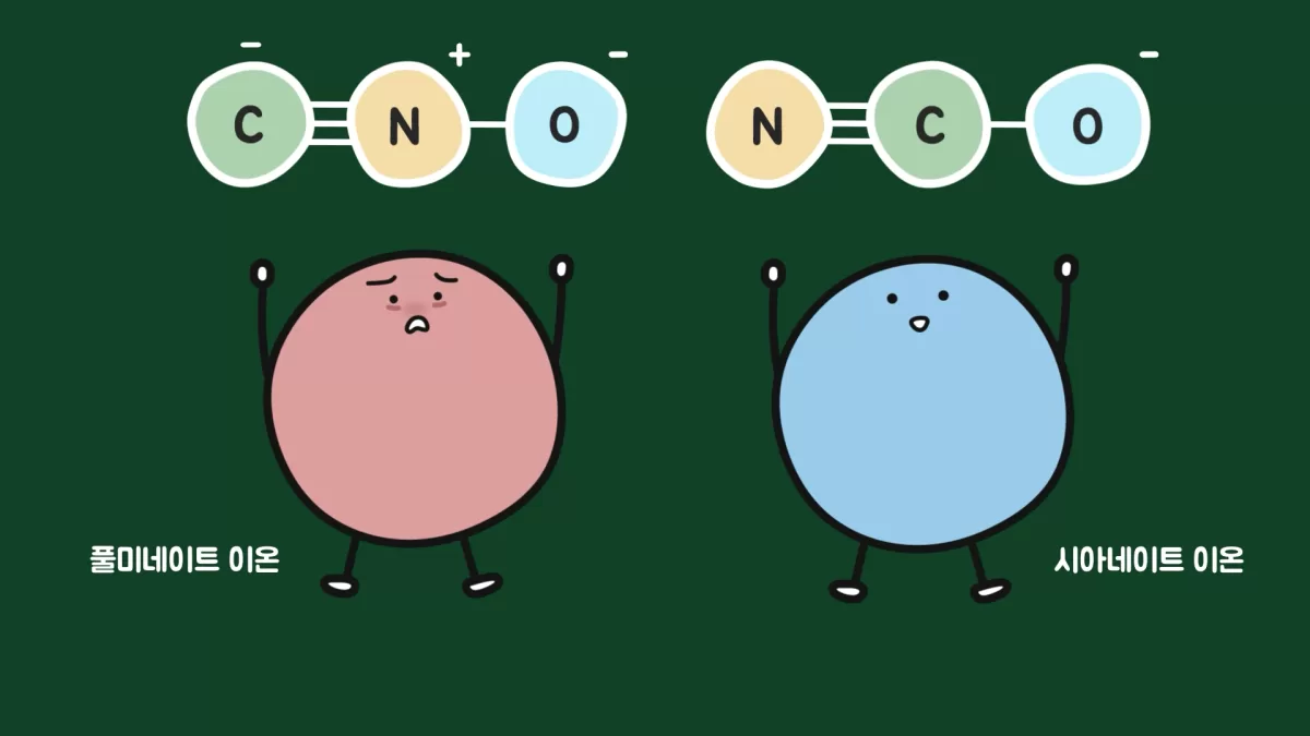 일단 두 이온 모두 탄소(C)와 질소(N), 산소(O)가 하나씩 결합되어 만들어집니다. 그런데 풀미네이트 이온은 탄소-질소-산소(CNO)의 순서로, 시아네이트 이온은 질소-탄소-산소(NCO)의 순서로 결합되어 있습니다.