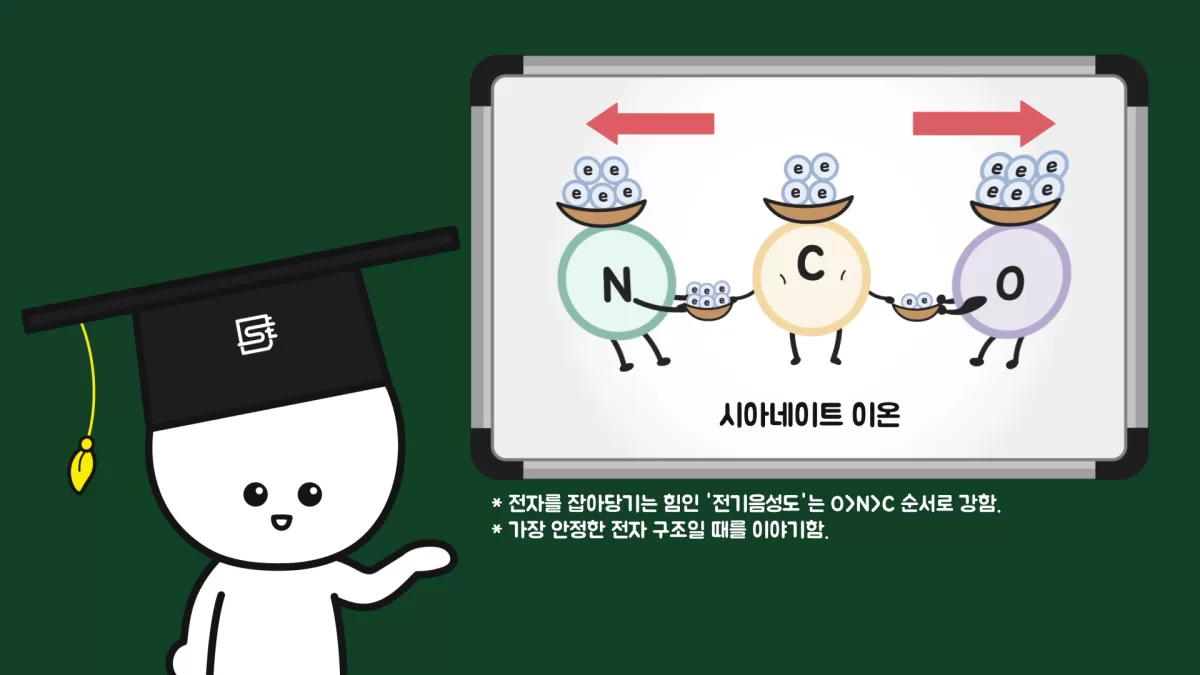 두 이온의 전자 분포 상황을 이해하기 쉽게 그림으로 표현해보면 위와 같고, 시아네이트 이온은 공명 구조를 형성하면서 풀미네이트 이온에 비해 상대적으로 고른 전자 분포를 만들어 냅니다.