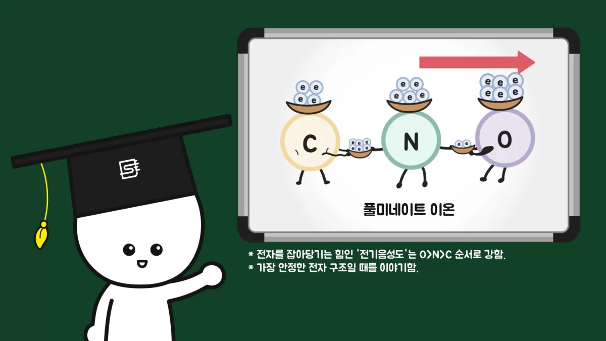또한, 전기음성도가 큰 산소에 전자가 밀집해 있어 상대적으로 안정적입니다. 반면 풀미네이트 이온은 전자를 분산시키기 못하고, 탄소와 산소에 전자가 밀집해있고 불안정합니다.