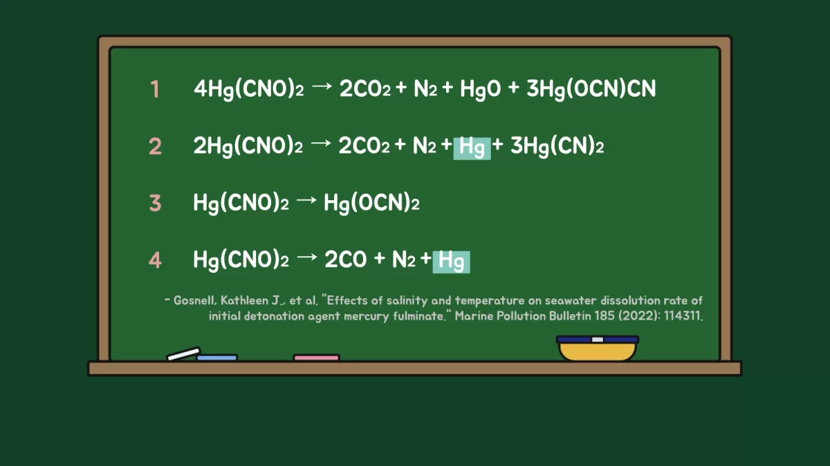 그리고 폭발할 때 발생하는 화학 반응을 살펴보면 네 가지의 화학 반응이 있는데, 풀미네이트 수은이 화약으로 쓰인 경우 흡입·접촉·섭취 시 심각한 건강 문제를 일으키는 수은(Hg)이 발생할 수 있으니 내용물을 만지는 건 권장하지 않습니다.