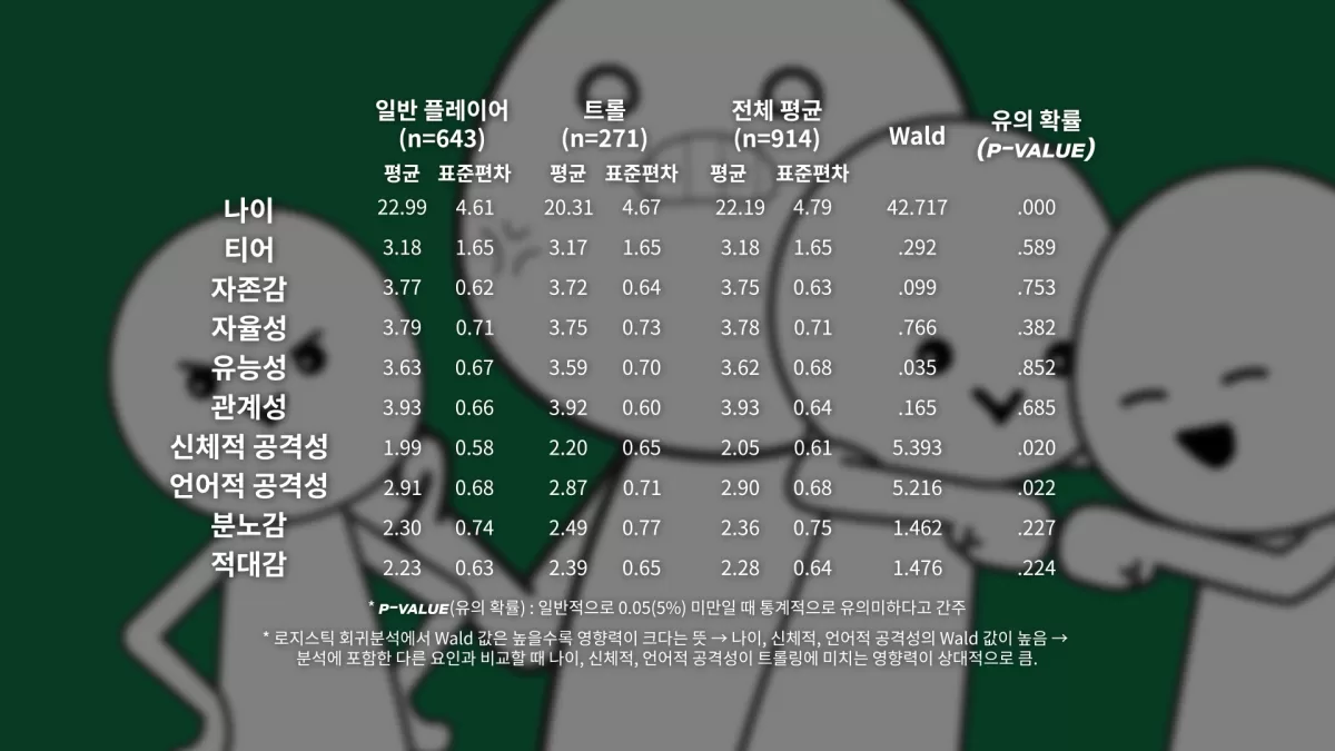 분석 결과에 따르면 통계적으로 유의미한 요인에 나이와 신체적·언어적 공격성이 확인됐습니다. 나이가 어릴수록 트롤링할 확률이 높았는데, 다른 선행 연구에서도 나이가 어린 플레이어들은 게임 내 상호작용에서 비방이나 비난과 같은 부정적인 상호작용을 할 가능성이 높았던 것과 일치하고, 분석 데이터에 따르면 나이가 한 살 증가하면 트롤이 될 가능성이 약 11.5% 줄어든다고 합니다.