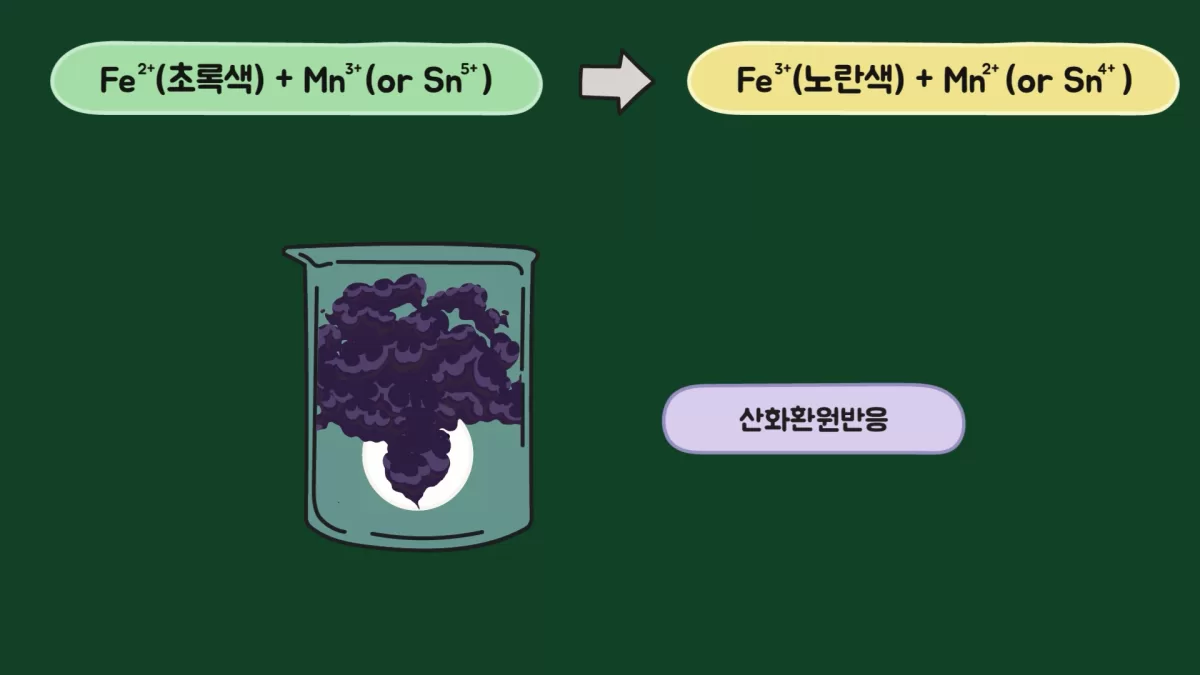 그렇다면 반대로 초록색의 유리를 투명하게 만드는 방법은 없을까요? 철 이온을 제거하는 것은 복잡하고 비경제적이라서 유리 탈색제를 넣어 화학 반응으로 철의 산화수를 바꾸는 방법을 쓰고, 소량의 망가니즈(또는 주석) 산화물을 넣어주면 산화환원반응을 통해 철 이온을 변화시킬 수 있습니다.