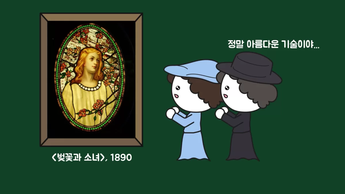 그리고 중세와 근세를 넘어 근대에 들어서면서는 새로운 미술이라는 의미의 아르누보(Art Nouveau) 시대가 열리는데, 티파니 유리가 유행합니다. 대표적으로 <벚꽃과 소녀>라는 작품이 있는데, 모든 티파니 유리 기술이 포함된 작품입니다.