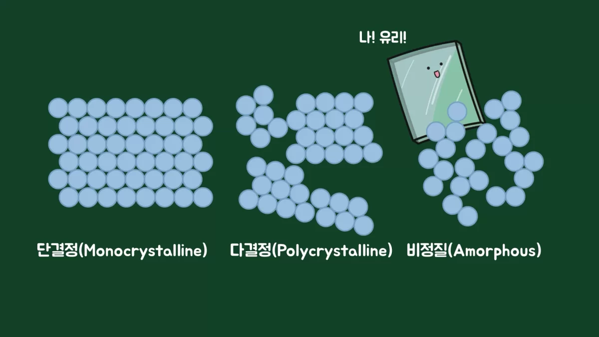 그런데 고체에도 종류가 있습니다. 고체 중에서 매우 높은 질서로 원자들이 정해진 자리를 지키며 반복적으로 배열된 고체를 단결정이라고 하고, 결정성은 갖지만 작은 결정들이 모여 하나의 큰 덩어리를 이루는 고체를 다결정이라고 합니다. 한편 원자들이 질서 없이 무작위적으로 배열된 고체도 있는데, 이를 비정질라고 하며, 유리가 해당합니다.