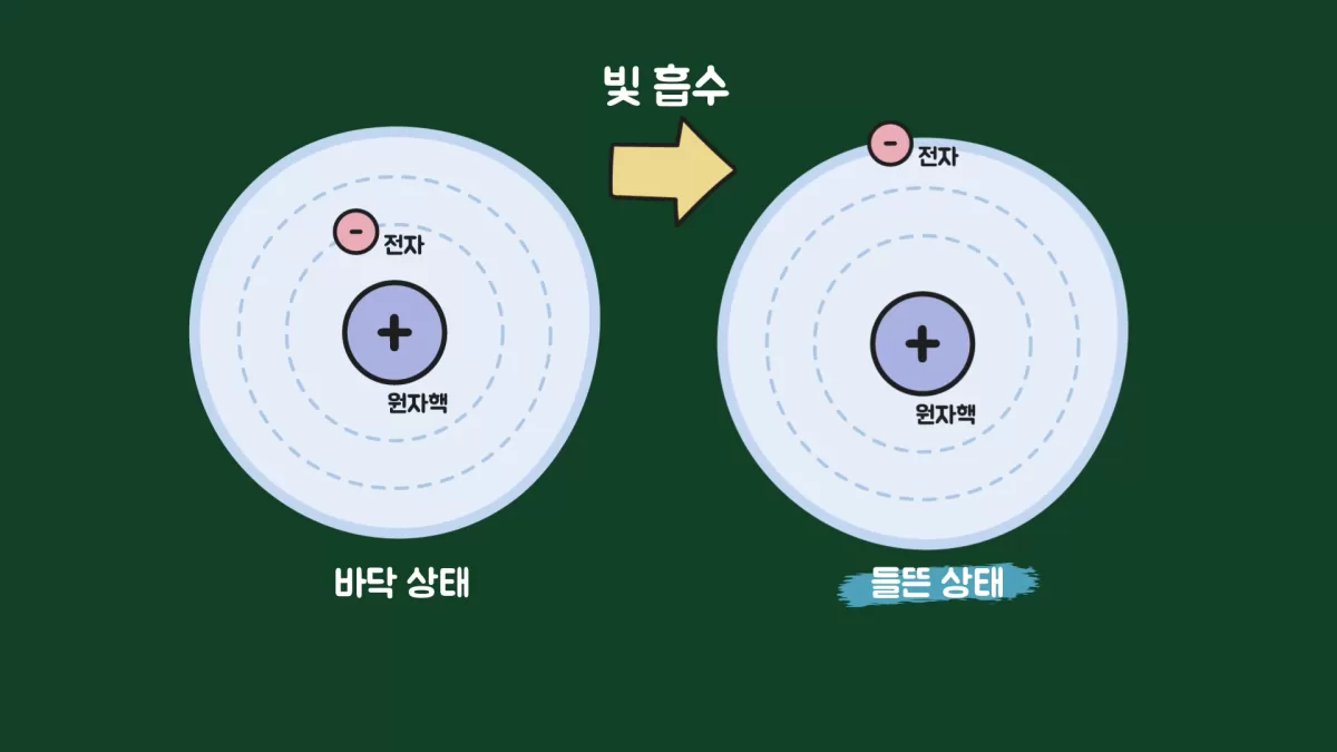 모든 물질은 원자로 이루어져 있으며, 원자 안에는 전자가 존재합니다. 전자는 특정한 에너지 준위에 위치해있고, 에너지가 높은 빛이 들어오면 빛에너지가 전자를 더 높은 준위로 이동시키려고 합니다. 이를 들뜬 상태라고 하고, 이 경우는 빛의 흡수가 일어납니다.