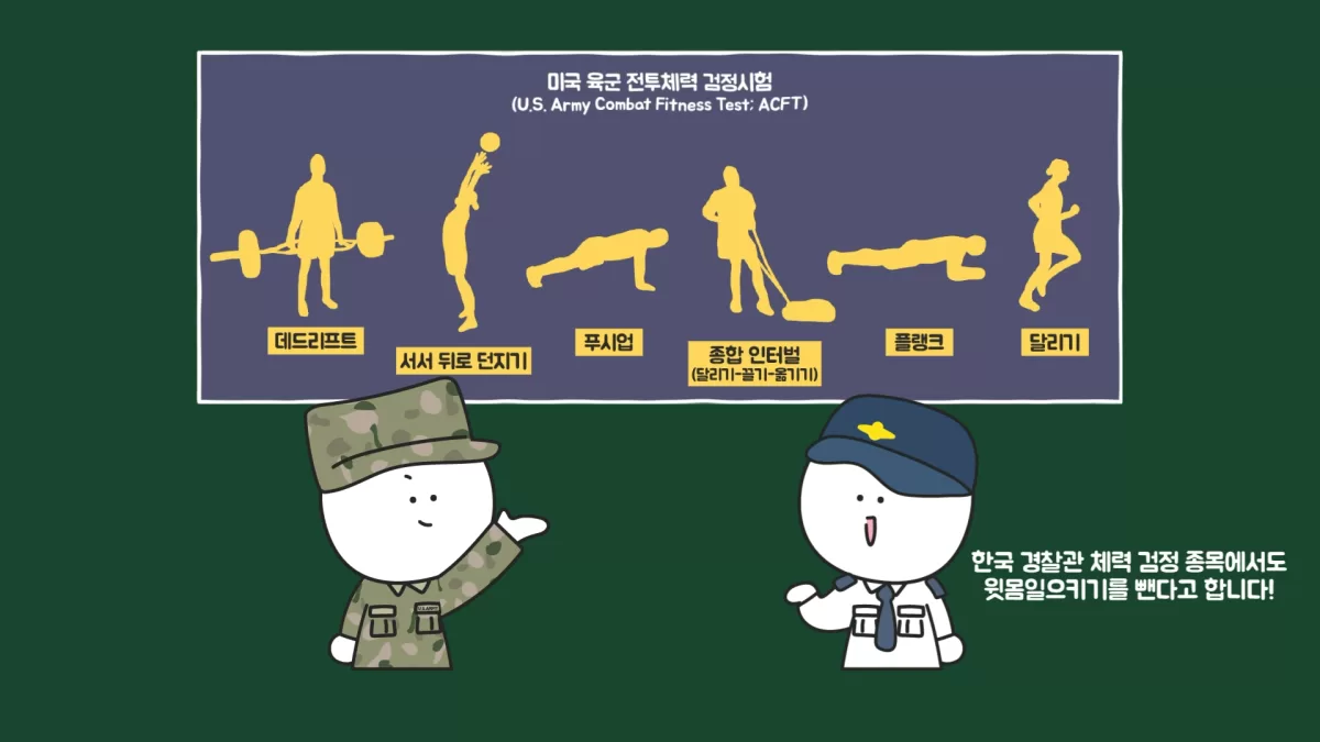 여기까지 살펴봤다면 윗몸일으키기는 피해야 하는 동작처럼 보이는데, 지금도 여전히 체력검정에 포함되어 많은 사람이 하고 있습니다. 이와 관련해 미국 육군은 체력검정 방식을 단계적으로 개편해 2020년 10월부터 새로운 검사 방식을 도입했습니다.