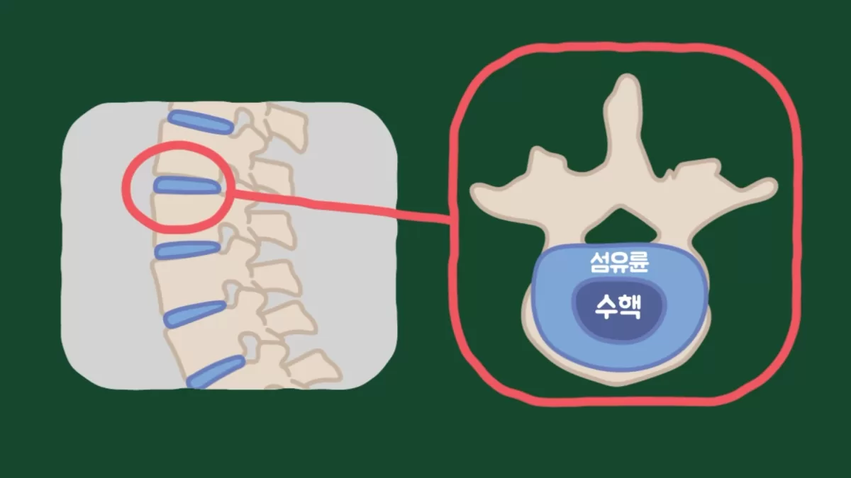 디스크는 젤리 같은 점성을 가진 조직인 수핵과 수핵을 둘러싼 단단한 섬유조직인 섬유륜으로 구성되어 있고, 척추뼈 사이를 지탱해주는 역할을 하면서도 탄력성이 있어서 척추가 움직일 수 있게 해주는 역할과 충격을 흡수해주는 완충 역할도 합니다.