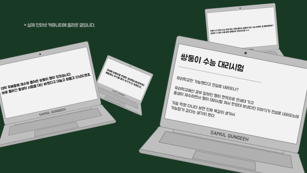 하지만 시도하는 사람이 있긴 합니다. 2000년대 초반에 대리시험을 보는 일란성 쌍둥이를 적발한 적이 있었고, 운전면허 필기시험에서도 대리시험을 보는 쌍둥이 형제를 적발한 적이 있었습니다.