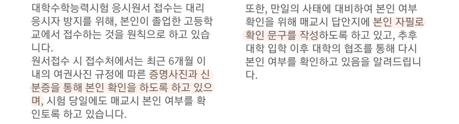 의문을 해결하기 위해 교육부에 문의했고, 답변을 받았습니다. 답변이 길게 왔으나 시험을 치를 때 특별히 구별하고 있지는 않아 보입니다. 다만, 주목할 점은 문제가 생겼을 때 필적확인을 통해서 본인 여부를 확인할 수 있다고 설명합니다.